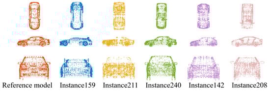 In addition, we test the proposed searching scheme on objects with unseen categories using a mixed dataset comprising the MPI Dynamic FAUST dataset, ModelNet40 dataset, and SHREC’20 dataset. The SHREC’20 dataset [54] includes an elastic-stuffed toy rabbit with 11 partial scans and one full scan. For this experiment, we focus on the “Car” category from the ModelNet40 dataset with as the reference instance , resulting in a total of 310 candidate instances. We set and . Table 9 shows the ablation study results. Due to , there are five candidates entering , as shown in Figure 19. It can be seen that the proposed searching scheme can locate targets in objects with unseen categories.