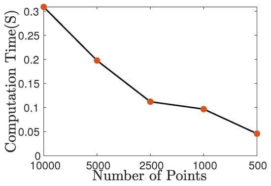 To explore the influence of the number of points on computation time, we downsample the MVP dataset (motorcycle) to 10,000, 5000, 2500, 1000, and 500 points, respectively, while comparing the computation time. The computation time is shown in Figure 22. Please note that the computation time is the time for registering the model with 10,000, 5000, 2500, 1000, and 500 points to the model with 10,000 points, respectively. It can be seen that as the number of points decreases, the computation time becomes shorter.