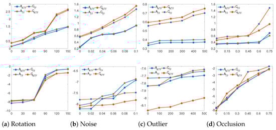Registration on synthetic datasets. The source model is downsampled by selecting ∼1500 points to generate model . The performance is evaluated under various perturbations: (1) Rotation: The initial angle is 0°, 30°, 60°, 90°, 120°, and 150° [default = 0° to 45°]. (2) Noise: The standard deviation of Gaussian noise is set to 0, 0.02, 0.04, 0.06, 0.08, and 0.1 [default = 0]. (3) Outliers: We set the number of outliers to 0, 100, 200, 300, 400, and 500, respectively [default = 0]. (4) Occlusion: The occlusion ratio is set to 0, 0.15, 0.30, 0.45, 0.60, and 0.75 [default = 0]. The random translation of all generated scenes is within . When one parameter is changed, the values of other parameters are fixed to the default value. We will test 750 test samples in each variable setting.