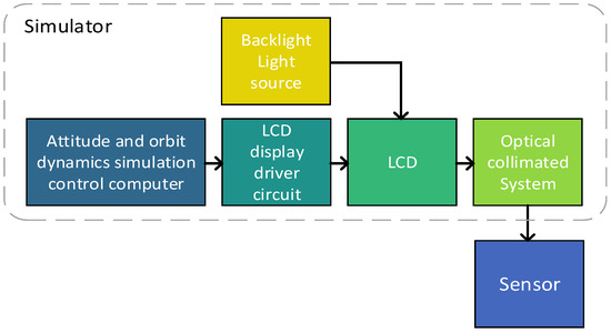 The composition of the dark-and-weak-target simulator is shown in Figure 1. It can be seen that it comprised an attitude-and-orbit-dynamics simulation control computer, an LCD display driver circuit, a backlight light source, an LCD display, and a collimating optical system.