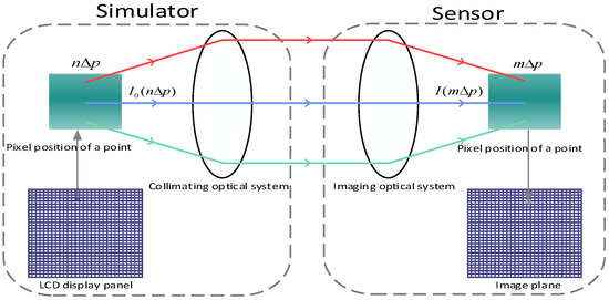 The process of energy transfer from a pixel point on an LCD display panel to an image plane can be understood as a mapping relationship in which a pixel point on the LCD display is eventually mapped to a corresponding position on the image plane. On this basis, each pixel point on the LCD display panel can be regarded as a point light source, and a transfer function can be used to represent changes in the light ray during the propagation process. We therefore established an energy transfer model, as shown in Figure 2. We then calculated the light intensity received at different positions on the image plane using Equation (2), and finally obtained the light intensity on the image plane .