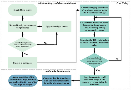 For the present study, we introduced an adaptive compensation algorithm based on pixel-by-pixel fitting. Provided that the uniformity of the light source satisfied our study requirements, the algorithm was able to use sensors to acquire output images with different gray levels; these were displayed by the dark-and-weak-target simulator. The response error surface of the dark-and-weak-target simulator could then be calculated, based on the acquired images. The brightness of each pixel of the dark-and-weak-target simulator was adaptively compensated and adjusted using the error surface, and the compensated output image was then acquired. Finally, grayscale standard display function (SDF) values [17] in the captured images before and after compensation were calculated, so that any improvement in uniformity in the light intensity distributed on the image surface of the dark-and-weak-target simulator could be evaluated. The overall compensation process is set out in flowchart form in Figure 3.