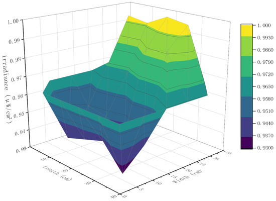 The results of the irradiation inhomogeneity testing are shown in Table 1. Irradiation inhomogeneity was calculated by bringing the test results into Equation (4); these data were normalized and plotted to show variations in illuminance corresponding to different positions on the irradiated surface, as shown in Figure 7.