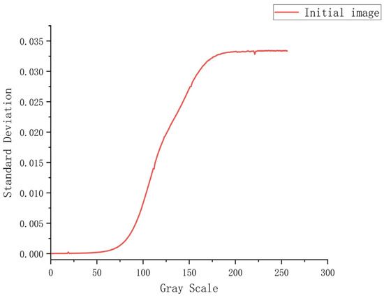 Dark-field correction was used to compensate for the dark current of the sensor, and normal operation of the LCD at operating and storage temperatures was ensured by hardware cooling under constant temperature conditions, so that the dark-and-weak-target simulator output a total of 256 images recorded in 0–255 grayscale, and the sensor was used for one-by-one acquisition to obtain . The initial acquisition of the image of the grayscale SDF curve is shown in Figure 8. In the figure, it can be seen that with the enhancement of the gray value of the image, the larger the grayscale SDF value of the image, and the more uneven the image-plane energy. Initial-acquisition images with grayscale values of 0, 109, and 255 are shown in Figure 9, in which a gradual weakening trend from the center to the edges is clearly evident, along with irregularly bright areas at individual locations.
