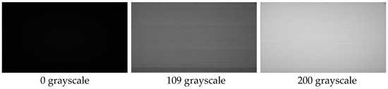 - Error fitting was performed while ensuring that the uniformity of the backlight source met the study requirements. We let the dark-and-weak-target simulator output 256 images in a grayscale range from 0 to 255, and allowed the initial grayscale matrix of the th output image to be , and the grayscale of each pixel to be , with and being the coordinates of the horizontal and vertical positions, respectively, for each pixel point), so that