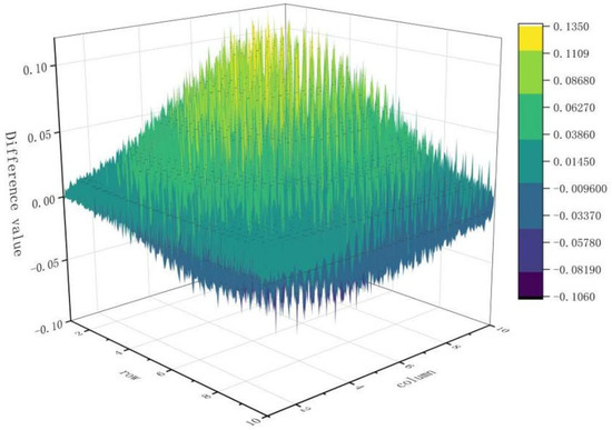 All initial acquisitions were then brought into the compensation algorithm, values for differences between each image and the mean image were calculated, and the cycle was superimposed. When superimposed to the 245th image, , , and . This satisfied the threshold condition and terminated the superimposition. Therefore, was the compensation surface . These results allowed us to determine that the surface had eliminated the difference value of the luminance. The response error surface of the dark-and-weak-target simulator is shown in Figure 10.