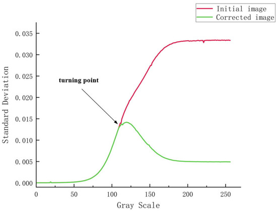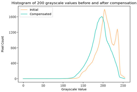 Having acquired a second, compensated image, we were able to bring both the initial and compensated images into Equation (14). The grayscale SDF of the acquired image before and after compensation was then calculated, in order to analyze any improvement in the uniformity of light-intensity distribution on the image surface of the dark-and-weak-target simulator, before and after compensation, so that