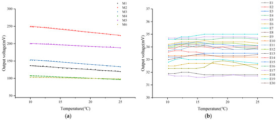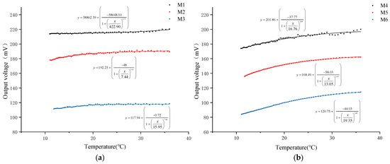 Relationship between temperature and DO sensor output voltage. (a) DO sensor corresponding to PFA; (b) DO sensor corresponding to FEP.