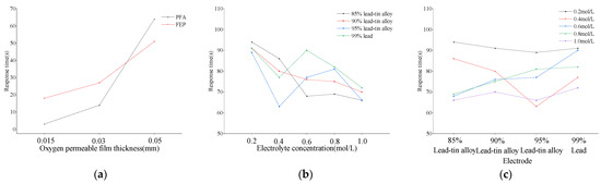 For electrolytes and electrodes, generally speaking, the higher the electrolyte concentration, the higher the transfer efficiency between ions, thereby accelerating the speed of electrochemical reactions. This helps to shorten the sensor’s response time and improve its rapidity [38,39]. The output signal of the sensor will also be enhanced accordingly. The concentration of the electrolyte also affects the linear measurement range of the sensor. A suitable electrolyte concentration can ensure that the sensor maintains a linear output over a wide range of DO concentrations. The standard electrode potentials of lead and tin are similar, so the two metals are easily deposited, improving the overall hardness of the electrode while enhancing chemical reactions. A suitable lead–tin ratio can improve the conductivity of the electrode, thereby accelerating the speed of electrochemical reactions and shortening the response time of the DO sensor [40,41]. In this study, the influence of electrolyte concentration and lead–tin ratio on response time is relatively small compared to the oxygen-permeable membrane. Therefore, if the rapidity of the galvanic DO sensor is to be improved, the choice of oxygen-permeable membrane material and thickness is particularly important.
