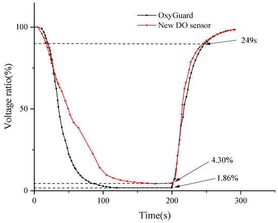 In DO measurement technology, the saturated DO voltage value serves as an important reference benchmark [42]. Therefore, in this study, the ratio of the output voltage to the saturated DO voltage was used as a quantitative indicator of the test results. Some of the output voltage data have been summarized in Table 7. Meanwhile, Figure 7 dynamically illustrates the trend of the ratio of output voltage to the output voltage under saturated DO conditions over time.