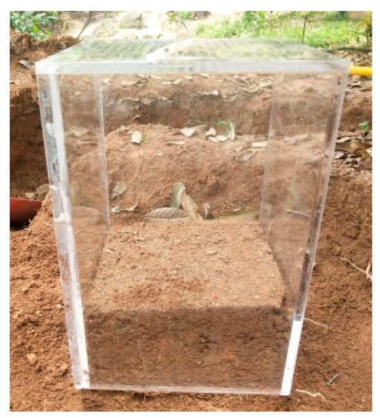 The test site was selected from a densely vegetated GRS slope in the northwest of Fuzhou, China. The surface layer of the slope in the test area contains weeds and the slope is gentle, as shown in Figure 1, and a more detail description can be found in the literature [35]. The schematic diagram of the undisturbed soil sampling process. The CT slices of U-GRS samples were collected with a C450KV high-energy industrial CT scanner of Shanghai Yinghua Testing Company. Representative slices of X-ray CT images of the soil samples are illustrated in Figure 2. The scanning parameters were set as follows: the working voltage was 450 kV, the current was 63 mA, and the scanning resolution was 0.15 mm [35].