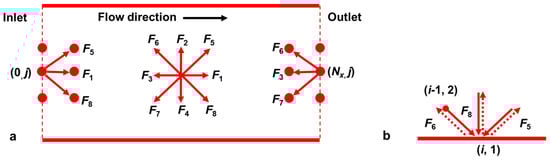 The periodic boundary defines that the model pore is infinitely long in the seepage direction, and the fluid particles enter the flow field from the inlet boundary, leave the flow field from the outlet boundary, and continue to enter the flow field from the inlet boundary in the next time step when they leave the flow field [44]. The specific implementation of the process is carried out as follows. As can be clearly seen in Figure 3a, the particle distribution function for the inlet boundary can be obtained from the migration of the outlet boundary, i.e.,: