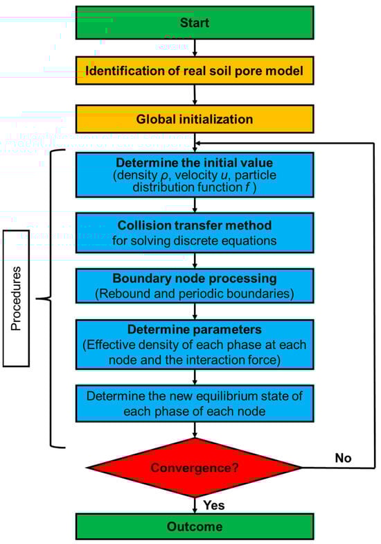 The Shan–Chen pseudo-potential model has been favored by more scholars by virtue of its ease in revealing the nature of the dynamics between multiphase multicomponent at microscopic scale [41]. The computational flow is shown in Figure 4.
