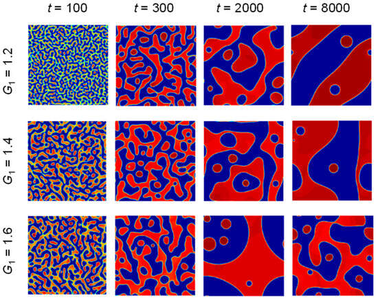 The two-phase separation process was simulated for the three cases of G1 = 1.2, G2 = 1.4, and G3 = 1.6, respectively, and the changes in the density distribution during the calculation process are shown in Figure 5. It can be found that with the increase in time, the two intermixed fluids are gradually separated, and with the increase in the strength of the interaction with the components G from 1.2 to 1.6, the speed of phase separation and polymerization increases, the phase interface is also gradually narrowed, and the transition region becomes clearer; the above analysis shows that the size of the value of G has an important influence on the degree of intermiscibility between the components.