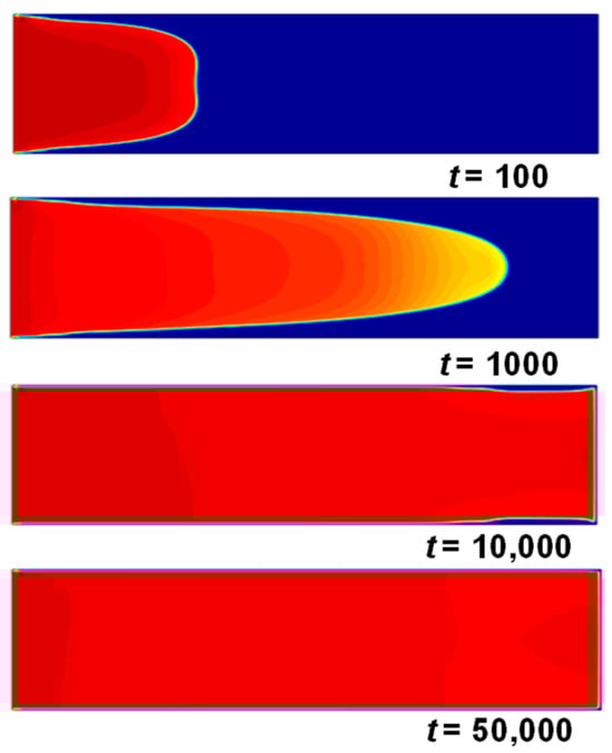 Schematic diagrams of the two-phase expulsion process at 100, 1000, 10,000, and 50,000 time steps are given in Figure 6. As can be found, the interface between the two phases gradually changes from flat to rounded, the degree of curvature increases, and the phenomenon of “fingering” is particularly significant. At the late stage of the replacement t = 10,000 time step, it can be observed that there are still a few replaced phases near the upper and lower walls of the replacement phase. The reason is that the existence of pseudo-velocity at the interface of the two phases makes the pseudo-potential model calculation appear to be a “false” phenomenon [46], but as shown in t = 50,000, with the prolongation of the replacement time, the displaced phase will eventually be displaced out of the channel. The results are consistent with those of the literature [22,32], which verifies the correctness of the replacement model adopted in this paper.