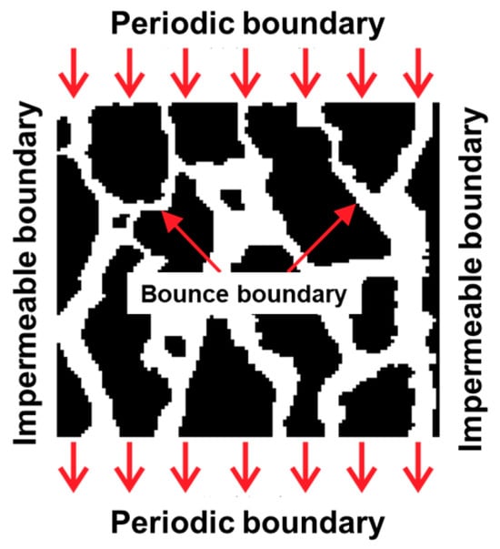 The seepage direction in the soil body is set to be along the depth direction of the soil body. The initial moment of the model is filled with the driven phase (gas phase) and the immiscible driven phase (water phase) is injected from the inlet, and the specific boundary conditions of the model are set up as shown in Figure 7. The units and related parameters of two-phase percolation are set according to the literature [22,32], i.e., all the units in this paper are dimensionless lattice units, while the density of the gas phase ρ1, the density of the water phase ρ2, the force at the interface between the two phases Gw, the force between the repellent phase and the solid wall Gwr, the force between the driven phase and the solid wall Gwb, the inlet velocity u, the lattice step size δx, and the time step δt are detailed in the parameters shown in Table 2.