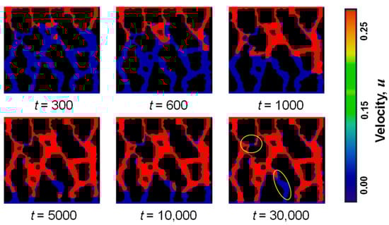 Figure 8 presents a dynamic visualization of two-phase seepage across various temporal intervals, delineating the driven phase (gas phase) in blue and the driving phase (water phase) in red. The forefront of the water-phase seepage demonstrates a “finger-in” progression, manifesting a preference for larger, more direct channels for infiltration, subsequently resorting to narrower, more tortuous pathways. A disruption in flow within certain constricted regions is highlighted by a yellow circle within the figure. This phenomenon can be attributed to two primary factors: firstly, the narrowness of the pore encircled in yellow, which impedes the ingress of water fluid; secondly, the existence of adjacent channels that are comparatively wider and straighter, where the water fluid preferentially migrates, engendering a pronounced pore preferential flow effect. This preferential flow effect has been observed in previous studies, where water preferentially flows through larger and more connected channels, while gas is displaced and trapped in smaller pores [9,47].