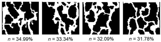 To study the properties of two-phase seepage of water–air at varying porosities, four GRS models with good connectivity and different porosities were selected, as illustrated in Figure 10. The porosities of the models were 34.99%, 33.34%, 32.09%, and 31.78%. These models had a size of 100 × 110 pixels, with a mesh computation area of 100 × 110 lattice points. All the parameters in the model were in lattice units, and the boundary conditions were treated as shown in Figure 7. The two-phase seepage process is also simulated with the hydrophobic wall [31,32] (Gwr = 0.2, Gwb = −0.2), respectively. The other computational parameters are the same as those in Table 2.