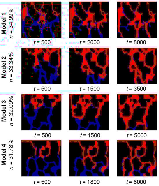 Figure 11 illustrates a step-by-step diagram illustrating the two-phase flow process for various porosity models. The graph indicates that the length of the two-phase flow path and the time needed to complete the process vary for different models with varying porosities. For instance, Model 1 and Model 4 require 8000 time steps, whereas Model 2 only needs 3500 time steps. This is due to the complex pore structures of Model 1 and Model 4, which contain interlaced pores, while Model 2 has relatively straight and single pores with fewer interlaced ones. The morphology of pore structure significantly influences the efficiency of water phase displacement of gas phase during two-phase flow [9,47].
