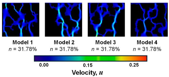 Figure 12 shows the distribution of the water-phase seepage velocity field of different porosity models after the stabilization of two-phase seepage. It can be found that the overall water-phase velocity values show a decreasing trend in turn, with model 1 exhibiting an overall velocity of u1 = 0.174, model 2 at u2 = 0.152, model 3 at u3 = 0.116, and Model 4 at u4 = 0.062. It indicates that when the seepage is stable, the overall velocity of the water phase decreases as the porosity of the model decreases, and the maximum value of the two-phase seepage velocity is smaller. Besides, Model 2 and Model 3 present a significant large pore preferential flow phenomenon, which is not apparent in the rest models. It indicates that the local seepage velocity is closely related to the pore structure morphology, and the generation of the preferential flow is not significantly correlated to the porosity [9,47,48]. The lack of a significant correlation between preferential flow and porosity highlights the importance of considering the spatial distribution and connectivity of pores when studying two-phase flow in undisturbed soil. Pore structure characteristics, such as the presence of narrow or wide channels, can have a significant impact on the flow behavior and the preferential migration of fluids. Therefore, a comprehensive characterization of the pore structure morphology is crucial for understanding and predicting the flow dynamics in undisturbed soil. These findings have important implications for soil management and engineering applications. Understanding the preferential flow behavior and its relationship with pore structure can help in designing more efficient drainage systems, optimizing irrigation practices, and predicting contaminant transport in soil. By considering the specific pore structure characteristics, engineers and researchers can develop more accurate models and simulations to predict and mitigate potential flow-related issues in soil systems.