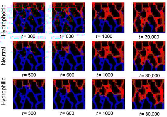 In order to investigate the influence of pore wall wettability on the two-phase seepage process of water and gas, the pore surface of the hydrophobic wall (Gwr = 0.2, Gwb = −0.2), neutral wall (Gwr = 0, Gwb = 0), and hydrophilic wall (Gwr = −0.2, Gwb = 0.2) are used as examples based on the model shown in Figure 7. The settings of the LBM model are the same as those in Section 5.1, where the hydrophobic wall was simulated. This section mainly simulates the two-phase seepage process under the conditions of a neutral wall and a hydrophilic wall. In order to facilitate the comparison of the three conditions, the time step selection is the same as those in Section 5.1, and the results of the calculations are shown in Figure 13.