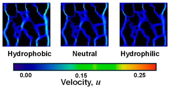 When examining the two-phase seepage process under various wall-wetting conditions (hydrophobic, neutral, and hydrophilic), it was discovered that the “finger-in” phenomenon occurred during the replacement process across all conditions in Figure 14. Additionally, the flow velocity varied significantly between different pores, with a more pronounced preferential flow effect in straight and larger pores. In a porous media model, an increase in wall hydrophobicity led to an increase in two-phase seepage velocity. This means that the stronger the hydrophobicity of the soil pore wall, as indicated by a larger wetting angle, the faster the corresponding flow rate [47]. The angle between the gas–liquid and solid–liquid interface lines at the intersection of the solid, water, and gas phases on the pore wall surface is commonly used to determine the hydrophilic or hydrophobic nature of the pore wall surface, as well as its strength. A 90° wetting angle is considered the critical point for the pore wall surface to exhibit both hydrophilic and hydrophobic properties. For hydrophobic walls, the seepage velocity will be accelerated to varying degrees depending on the strength of the hydrophobicity of the wall. This is because the wall will have a repulsive effect on the neighboring fluids. When the wall is hydrophobic, it repels water molecules, leading to a reduced interaction between the fluid and the wall surface. This repulsive effect reduces the resistance to fluid flow and allows for a higher seepage velocity in the presence of hydrophobic walls. Conversely, for hydrophilic walls, the seepage velocity will be decelerated to a certain extent due to the viscous effect produced by the hydrophilicity of the wall. Hydrophilic surfaces have a stronger affinity for water molecules, which leads to increased adhesion and a higher resistance to fluid flow. This viscous effect results in a decrease in seepage velocity when fluids come into contact with hydrophilic walls.