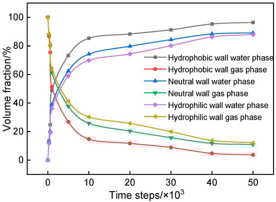Change of the two-phase volume fractions of the models with different wall wettability at different time steps (unit: step).