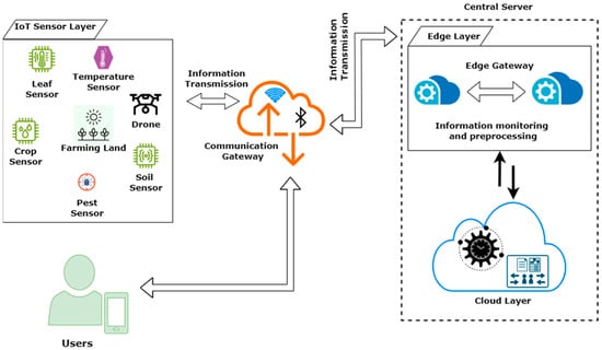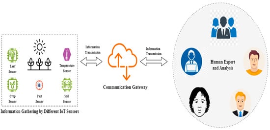 Conventionally, in smart farming, IoT sensors, cloud servers, and human experts are the three primary nodes that must be managed effectively. IoT sensors positioned systematically throughout the farm serve as the primary data collection points, gathering accurate details about crops and the surrounding environment [7]. On the other hand, cloud sensors act as the primary hub for data processing and storage, utilizing AI algorithms to analyze the gathered data and produce informative results. Within this system, the human expert, typically a farmer or farm manager, collects information, makes defendable judgments, and sometimes manually controls or modifies IoT devices in response to ideas given [8].