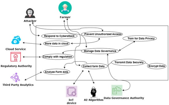 The above discussion illustrates how exhaustive the network of connections and protocols must be to ensure data security in the rural farm when employing AI and the IoT for a smart farming framework. This is illustrated in Figure 2, which highlights the critical measures that need to be taken to prevent security attacks and the roles of different stakeholders in a smart rural farm for monitoring and control.