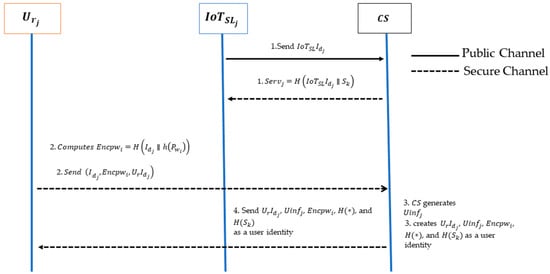 At the registration phase, the user, and the IoT server, , initiate a registration request to the central server CS. As a reciprocal action, the central server provides the user, , with the required values for the login and authentication stages to the IoT server, , as depicted in Figure 4.