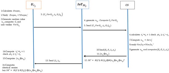 The verification of legitimate users is conducted during the login and verification phase as shown in Figure 5. The user, , sends a registration request message to the IoT sensor layer, , in order to log in, and verifies each entity. Then, , , and generates the similar session key.
