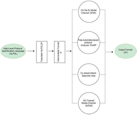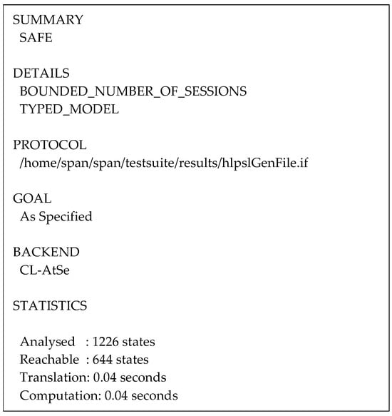 The robustness of the proposed protocol is tested using the AVISPA tool, which employs a role-based scripting language, High-Level Protocol Specification Language (HLPSL) that helps with protocol analysis and implementation to determine whether a security protocol is SAFE or UNSAFE [40]. AVISPA mimics the protocol behavior to find potential vulnerabilities using back-ends such as the OFMC (on-the-fly model checker), CL-AtSe (constraint-logic-based attack searcher), SATMC (SAT-based model checker), and TA4SP (tree automata-based security protocol), shown in Figure 6, of which the OFMC and CL-AtSe back-ends were used to simulate our proposed protocol. Also, the Dolev–Yao threat model was implemented to examine the presence of intruder attacks in the protocol [41].