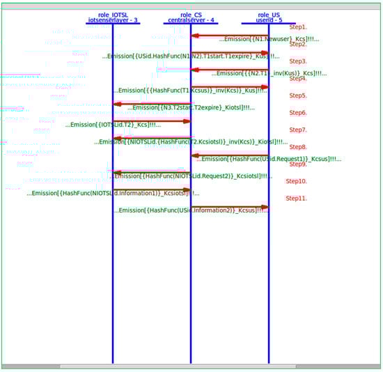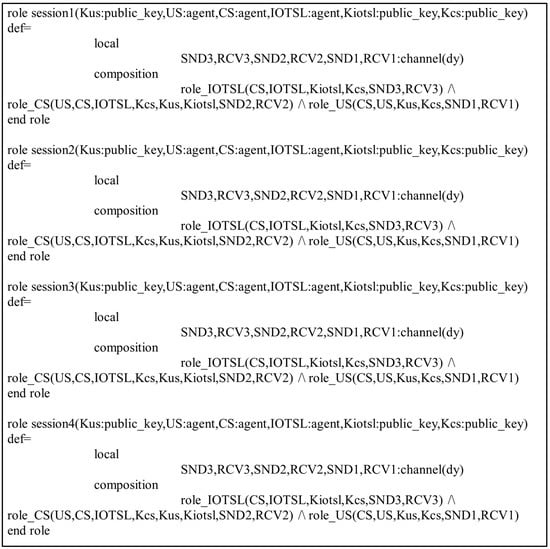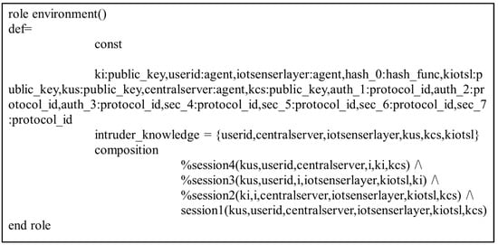 In the present study, the different entities, User, IoT Senser Layer, and Central Server, are represented as the agents US, IOTSL, and CS, respectively. Figure 7, Figure 8 and Figure 9 show the HLPSL script and their roles, while Figure 10, Figure 11 and Figure 12 discuss the HLPSL script of the sessions, environment, and goals. Figure 13 shows the SPAN protocol simulation built using the message sequence between the agents discussed in the next section.