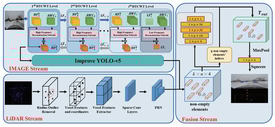 The network structure of this algorithm mainly consists of three parts: the image object-detection module, the point-cloud object-detection module, and the backend fusion module. To address the issue of image distortion caused by snowy weather, we introduce a novel hierarchical Dual-Tree Complex Wavelet Transform (DTCWT) snow removal theory [36]. By decomposing snowy-weather images into high-frequency and low-frequency components and adopting a hierarchical decomposition approach, different scales of snow can be decomposed into each sub-band, enabling precise segmentation of snowflakes of various sizes. In the image object-detection module, we enhance the detection accuracy of image targets by replacing the backbone network with InceptionNeXt [37] based on YOLOv5 and simultaneously introducing the Wise-IoU [38] algorithm. For the point-cloud object-detection part, as LiDAR point clouds in snowy-weather scenes are affected by snowflakes and may produce point-cloud noise, we utilize the Dynamic Radius Outlier Removal (DROR) filtering algorithm [39] to remove noise from the point cloud, therefore improving data quality. We then employ the SECOND [7] algorithm to detect point-cloud objects. Finally, in the backend fusion module, we utilize a backend fusion algorithm to fuse the detection results between the two sensors. We employ geometric consistency and semantic consistency to fuse our detection results, enabling the two modalities of network structures to operate independently without interference and allowing for separate training and combination. As shown in Figure 1.