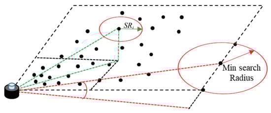 Figure 4 illustrates the principle of the Dynamic Radius Outlier Removal (DROR) filtering algorithm. This algorithm dynamically adjusts the search radius (Search Radius, S R i ) to better accommodate varying densities and distributions within point-cloud structures, therefore enhancing efficiency and accuracy in noise filtering and outlier removal. In the figure, the red ellipse represents the current search radius ( S R i ), which is dynamically adjusted based on local density to adapt to changes in point-cloud density. Additionally, the figure shows the minimum search radius (Min Search Radius), indicated by a red arrow. This minimum search radius ensures effective searching and outlier detection even in low-density areas. The black dots in the figure represent data points in the point cloud, illustrating the density variations in different regions. The algorithm demonstrates the adjustment process of using different search radii in various density regions through green and red dashed lines.