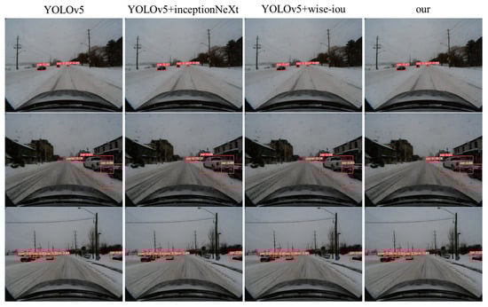 In Table 2. To demonstrate the overall performance improvement of our algorithm, we conducted ablation experiments comparing the enhanced Snow-CLOCs algorithm with the original CLOCs algorithm. Initially, we incorporated Improved YOLOv5 into the original CLOCs to improve the accuracy of 2D bounding boxes, resulting in an 8.86% increase in A B E V and an 18.56% increase in A 3 D in the easy mode. This enhancement addresses the poor fusion effect between 3D boxes and images due to the lower precision of the original CLOCs’ image-based object-detection algorithm. Subsequently, integrating the image noise filtering algorithm DCTW further improved A B E V and A 3 D by 1.99% and 3.04%, respectively, in the easy mode. Finally, by incorporating the Dynamic Radius Outlier Removal (DROR) filtering algorithm into the point-cloud part of our algorithm, we achieved an overall A B E V and A 3 D of 86.61% and 70.72%, respectively, in the easy mode.