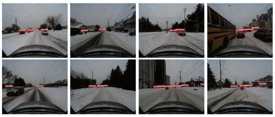 Figure 6. We present the 2D object-detection results of our algorithm on the validation set of the CADC public dataset. The red boxes indicate the target locations predicted by our algorithm, and the corresponding numbers represent the confidence scores (suggested to view in enlarged mode).
