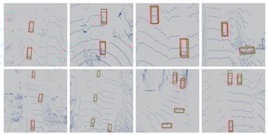 As shown in Table 3, we adopted the evaluation criteria from the KITTI dataset [41,42], categorizing targets into easy, moderate, and hard cases, corresponding to targets within 30 m, targets between 30 and 100 m, and targets beyond 100 m, respectively. We evaluated their detection accuracy on the bird’s-eye view and the precision of 3D detection boxes.