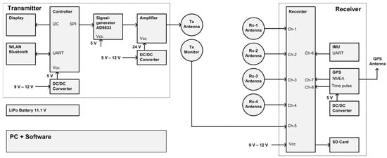 Hardware design of the Modular EMI System: The sensor comprises a variety of components that can be grouped in three sections: (1) the transmitter (left-side), (2) the receiver (right-side), and (3) software for processing and managing of the recorded data (bottom left). The label ‘VCC’ indicates the positive supply voltage input of sub-systems, ‘UART’ (Universal Asynchronous Receiver/Transmitter) indicates an asynchronous bi-directional serial communication port, ‘I2C’ (Inter-Integrated Circuit) indicates a standardized two-wire communication port between electronic components, ‘SPI’ (Serial Peripheral Interface) indicates a three-wire synchronous serial communication port between electronic components, and ‘WLAN’ (Wireless Local Area Network) is a network connection for system extensions.