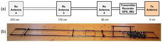 A light-weight mechanical support structure complements the system. This support structure consists of a pair of glass fiber tubes with an outer diameter of 20 mm and a wall thickness of 1 mm. Tubes are arranged in parallel in a distance of 28 cm from each other and joined with T-mounts. A pair of 200 cm long tubes are used for the instrument’s standard configuration, which can be extended through extra tubes to increase the separation between the transmitter and receivers. The antennas are fixed to the support structure with adhesive tape. The assembly of electronic sub-systems is mounted to the tubes with clamps, and loose wires are fixed with Velcro straps. Receiver antennas can be mounted in at a distance of between 50 cm and 370 cm from the transmitter antenna (see Table 1 for the default configuration). Electronic subsystems (signal generator, amplifier, recorder, GPS unit, IMU, and battery) are arranged together on a metallic rail and mounted to the support structure as a single unit as depicted in Figure 3b. The system is powered up by mating the female battery connector with its male counterpart which is connected to the electronic assembly. Data recording is started and stopped with a joystick on the recorder.