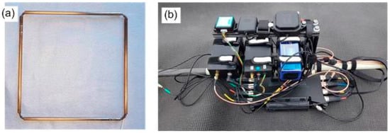 Pictures of the electronic sub-system: (a) receiver coil antenna; (b) assembled signal generator, amplifier, recorder, GPS unit, IMU, and battery.