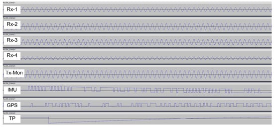 Exemplary signal records, corresponding to 25 milliseconds of data in an eight-channel wav. file. Traces Rx-1 to Rx-4 show the analog signals originating from the receiver antennas, Tx-Mon the analog signal from the transmitter monitor, IMU the data stream from the inertial motion unit, and GPS and TP the digital NMEA data stream and the time pulse signal from the GPS unit. The amplitudes of the signals are determined during post-processing by combining recorded values with recorder gain and calibration parameters.