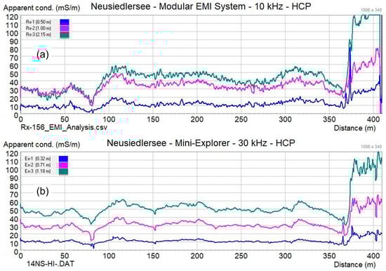Apparent electrical conductivity (mS/m) measured along a 400 m long line in the shore of the lake Neusiedlersee. Measurements were performed with (a) the proposed MEMIS and (b) the CMD-Mini-Explorer from GF-instruments.