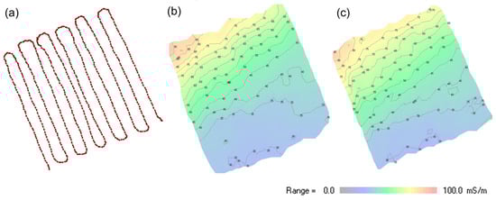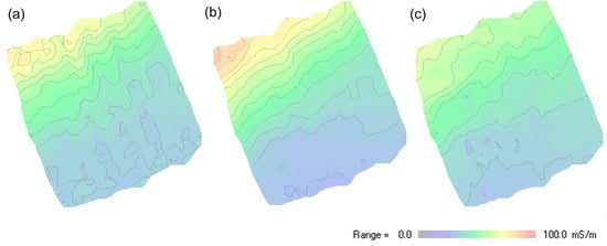 Apparent electrical conductivity (mS/m) of the 25 m × 25 m mapping area shown in Figure 8 above, measured with the MEMIS at different transmitter-receiver coil separations: (a) coil separation 90 cm; (b) coil separation 170 cm; and (c) coil separation 370 cm.