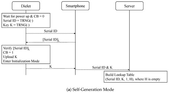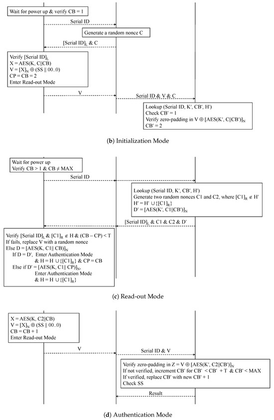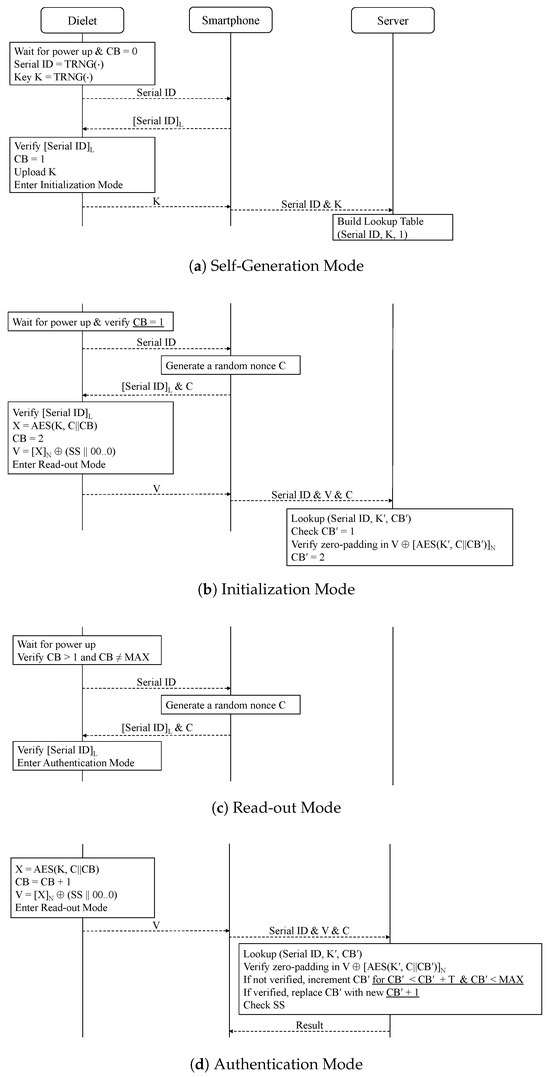 It should be noted that the authors in [25] states that each dielet performs one authentication session during this stage. The session begins by waiting for power up and verifying CB > 1 and CB ≠ MAX. However, in the initialization mode, the value of CB must be one, which means it cannot satisfy this condition. Therefore, the first authentication session should verify if CB = 1 and commence by transmitting the serial ID to the smartphone, as we have corrected in Figure 3b.