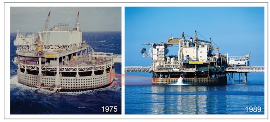 Subsidence recorded at the Ekofisk Platform over a period of 14 years: on the left, a photo taken in 1975 shows the platform shortly after its installation; on the right, the same platform in 1989 reveals significant changes due to subsidence (red marker). The picture is reproduced with permission. (Photo credits: Image 1975, ConocoPhillips/Norwegian Petroleum Museum; Image 1989, Husmo Foto/ConocoPhillips/Norwegian Petroleum Museum.