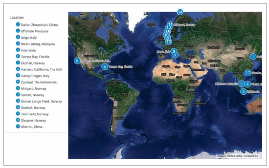 Location of the case studies analyzed in this review. The map shows the global distribution of the 17 case studies analyzed, with each numbered marker corresponding to the listed locations on the left.