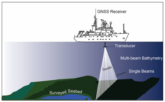 Multi-beam bathymetry survey (modified after Tay et al., 2013 [85]). This schematic illustrates the process of a multi-beam bathymetry survey conducted from a survey vessel equipped with a GNSS receiver and transducer. The transducer emits multiple beams that cover a swath of the seabed, providing detailed topographic data.