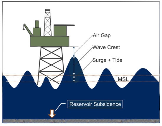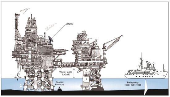 To safeguard the health of these assets and prevent unintended consequences for the activities and for the environment, subsidence monitoring is a critical component for the correct estimation, management, and mitigation of operational-related hazards [8]. Subsidence is mainly caused by the compaction of reservoirs and its transmission to the seafloor via the overburden [9,10]. Subsidence, if not regularly monitored, can cause serious damage to an infrastructure [11]. Offshore platforms, in fact, need to have a minimum clearance from the mean water level to the topside of the structure. If this air gap is reduced, it raises the risk of deck wave inundation and related wave slam; thus, the level of subsidence could have a substantial impact on a facility’s safety. Wave-in-deck loading causes (a) a higher overall platform loading and a higher danger of structural failure and (b) water getting into the cellar deck [12]. As seen in Figure 1, the loss of the air gap and the resulting reduction in platform safety during storm events led to the 1987 Ekofisk platform jacking operations and the installation of a barrier wall around the 2/4 T platform in 1989. The combined cost of these subsidence remediation efforts approached USD 1 billion [13] Additionally, subsidence can also impact productivity (there is a potential for detrimental effects caused by productivity decline), well integrity (i.e., overburden deformations may result in tubing leaks and, consequently, well workovers [10]), be a flooding hazard, damage the pipeline, and affect casing integrity [8].
