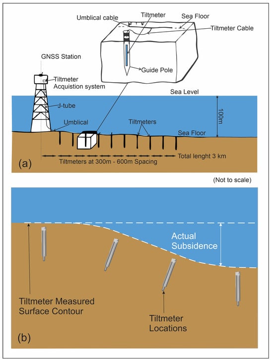 As explained in the account by [43], the company D’Appolonia™ proposed adaptations to a preceding study conducted by Anderson [44], Fabian and Villinger [45] with the tiltmeter. The modifications included the utilization of tiltmeters for analyzing surface deformations linked to volcanic activities and seismicity. This technique, as endorsed by Miandro et al. and Temizel et al. [43,46], emerges as an appealing methodology for assessing alterations at the ground level, with the collection of surface tiltmeter data in conjunction with GNSS measurements. The proposed system’s architecture as seen in Figure 7 incorporates pivotal components such as a GNSS station for capturing vertical platform displacement, a J-tube for umbilical purposes, an array of tiltmeters systematically positioned on the seafloor with predefined orientations and spacing, and an umbilical cable encompassing electrical conduits and robust cordage, serving to connect the tiltmeters to the data acquisition system established on the platform. Detailed design specifications for key system constituents, including the tiltmeter, guide pile for tiltmeter installation, tiltmeter cable, and umbilical cable, were also furnished.